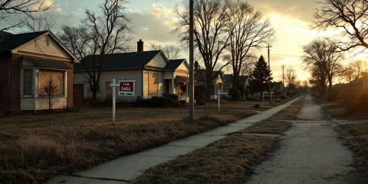 Residential street lined with houses, featuring numerous "For Sale" and "For Rent" signs on the lawns.
