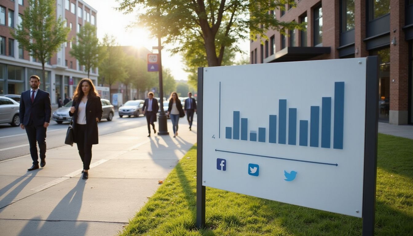 People walk along a city sidewalk near an office building; a sign in the foreground displays a bar chart and social media icons.