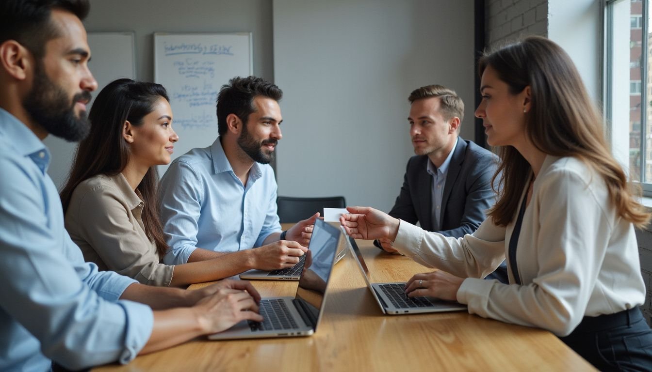 Five people sit around a table with laptops, engaged in a discussion in a modern office setting. One woman hands a business card to a man across the table.