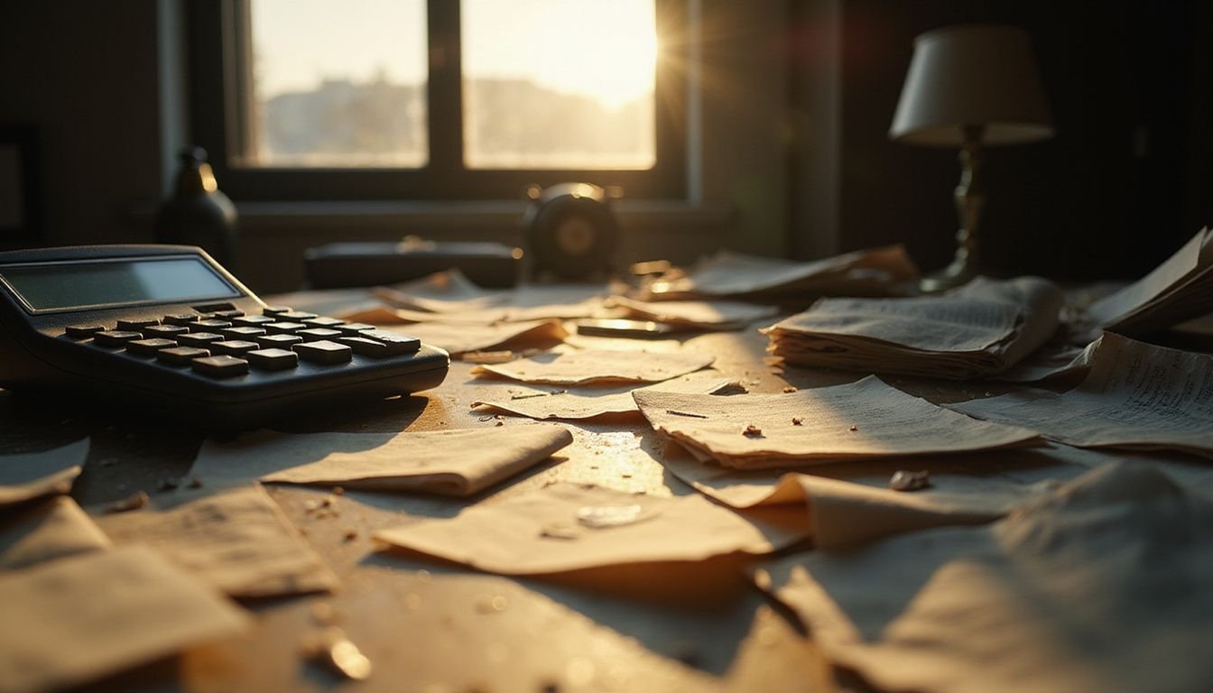 A desk covered with scattered papers, a calculator, a lamp, and other office items, with sunlight streaming through a window in the background.