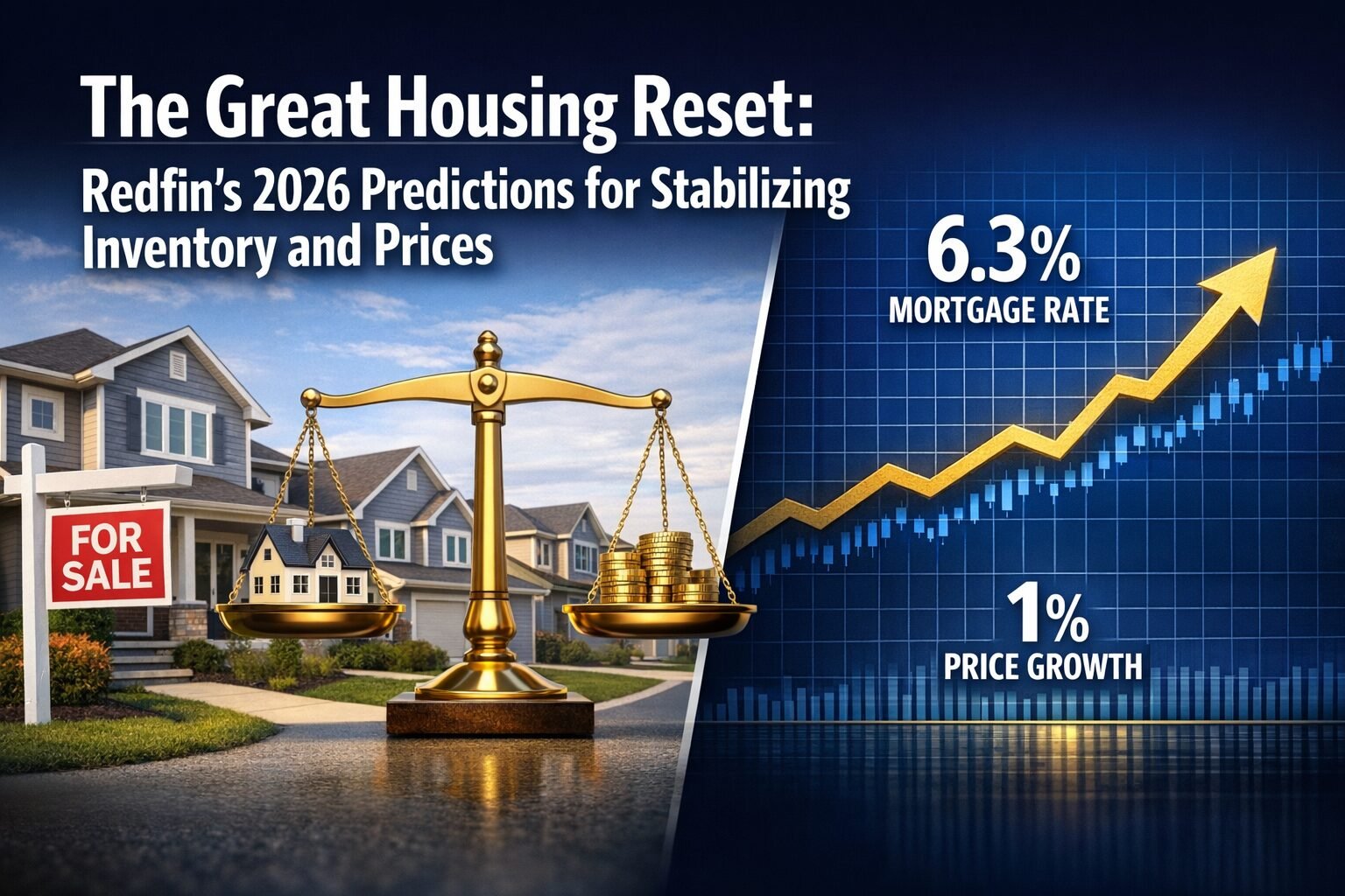 Graphic showing houses for sale, a scale with coins, and a rising graph; text highlights Redfin’s 2026 predictions: housing reset with a 6.3% mortgage rate and 1% price growth.
