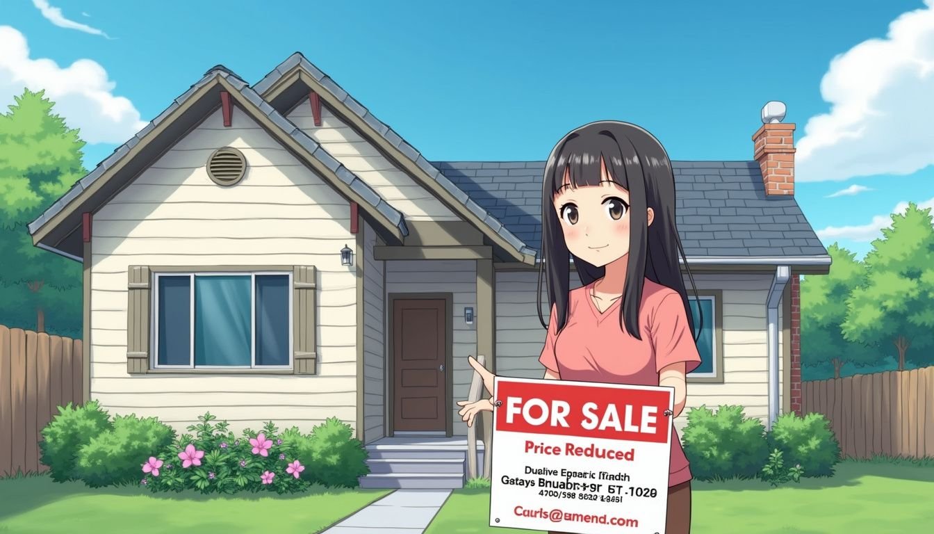 Anime-style illustration of a girl holding a "For Sale: Price Reduced" sign in front of a single-story house with a yard and flowers.